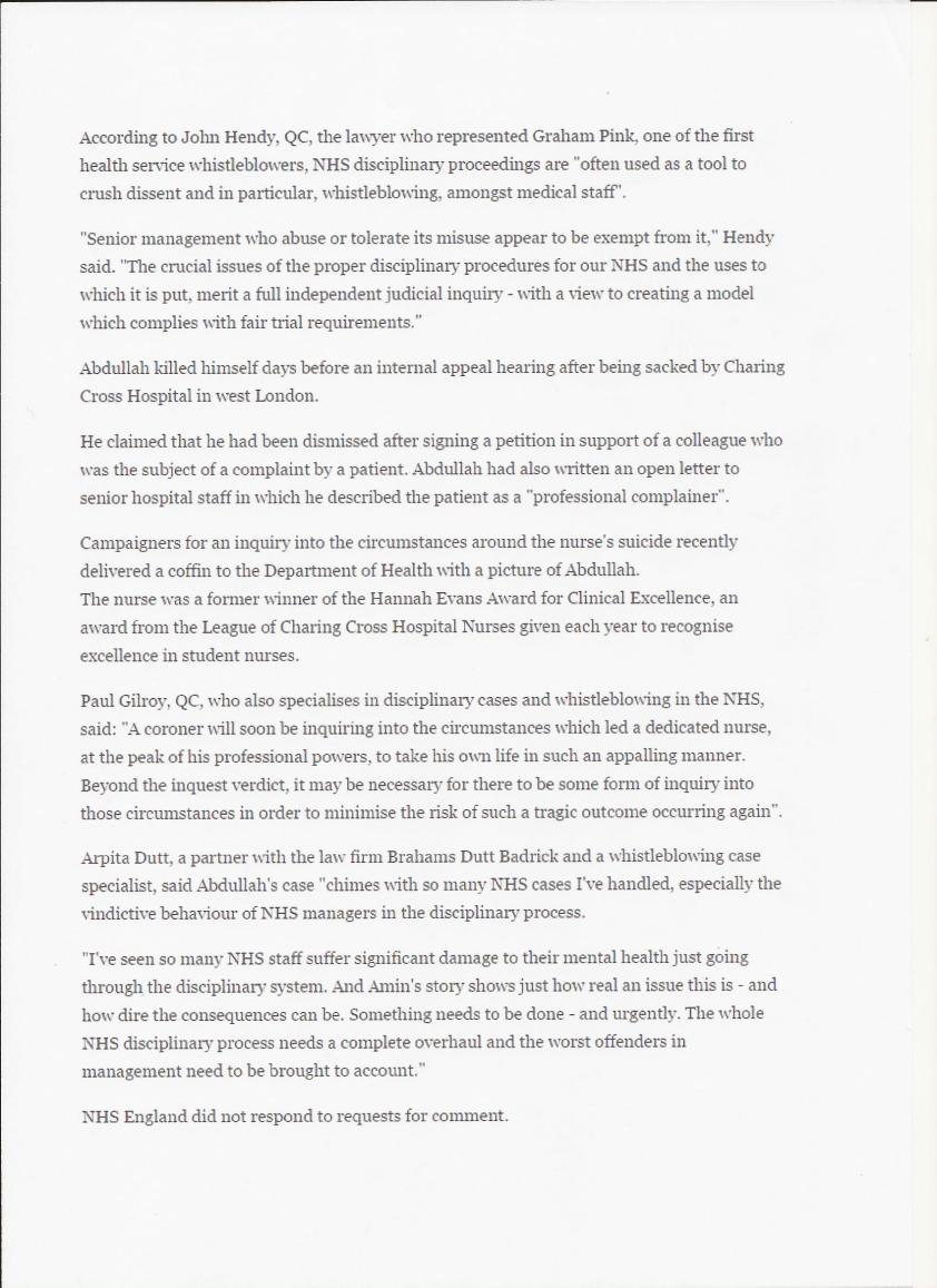 “Dr Minh Alexander referred Paula Vasco-Knight to CQC on 12 October 2015 regarding Fit and Proper Person issues, and as of 11 May 2016, has not yet received a substantive response. However, St. George’s has disclosed a copy of a letter from Mike Richards CQC Chief Inspector of Hospitals to St. Georges dated 16 February 2016, closing the matter. This is the letter.”